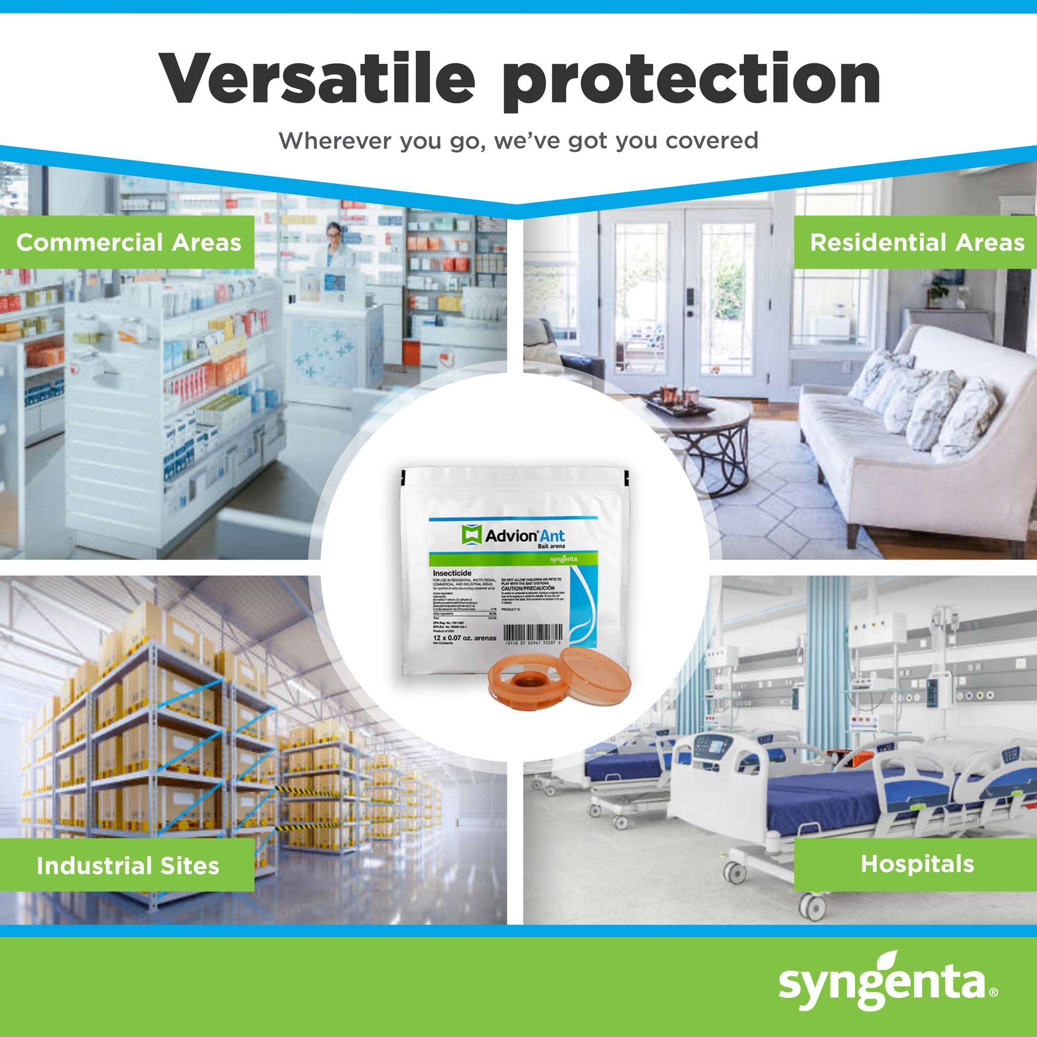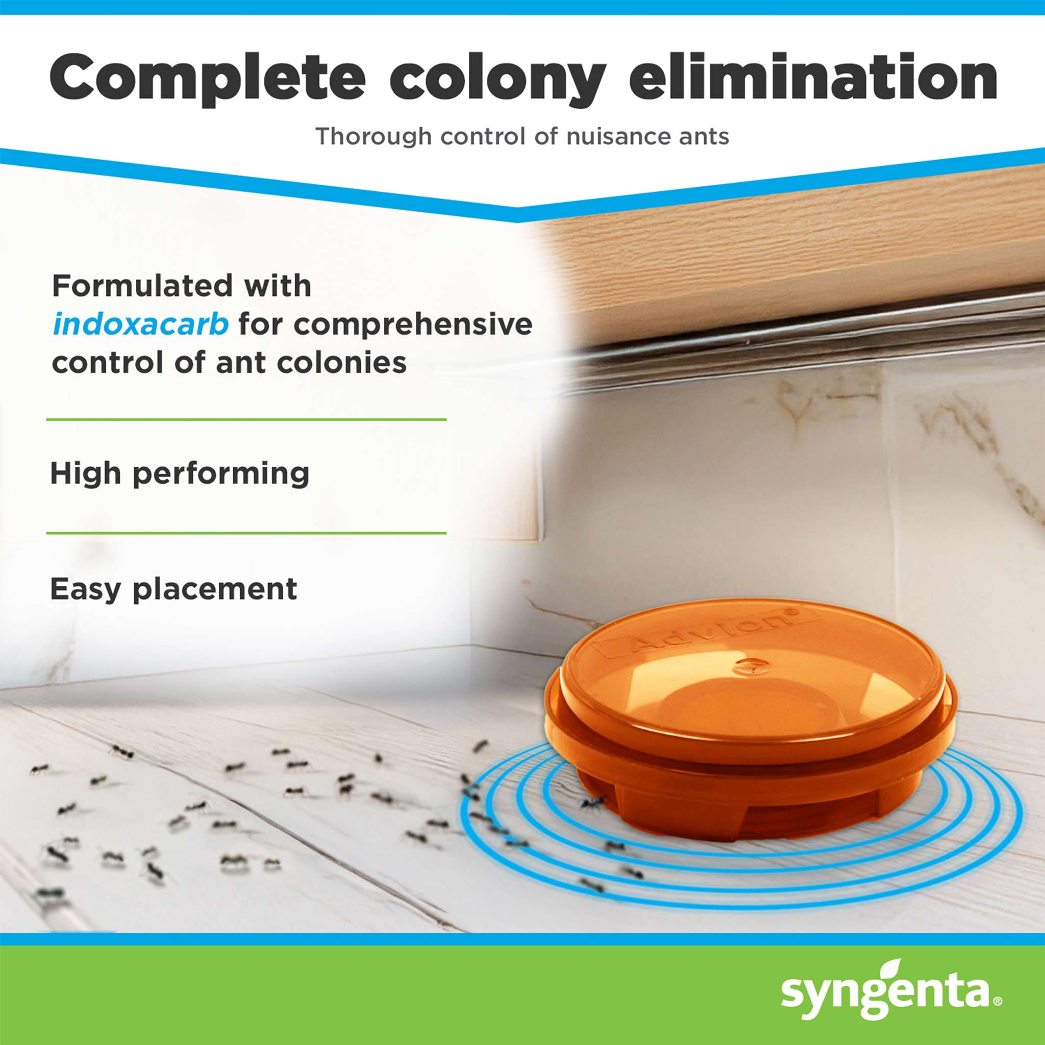 Syngenta Advion ant bait arena provides complete control of nuisance ant colonies with the active ingredient indoxacarb, an insecticide that acts through ingestion by ants.