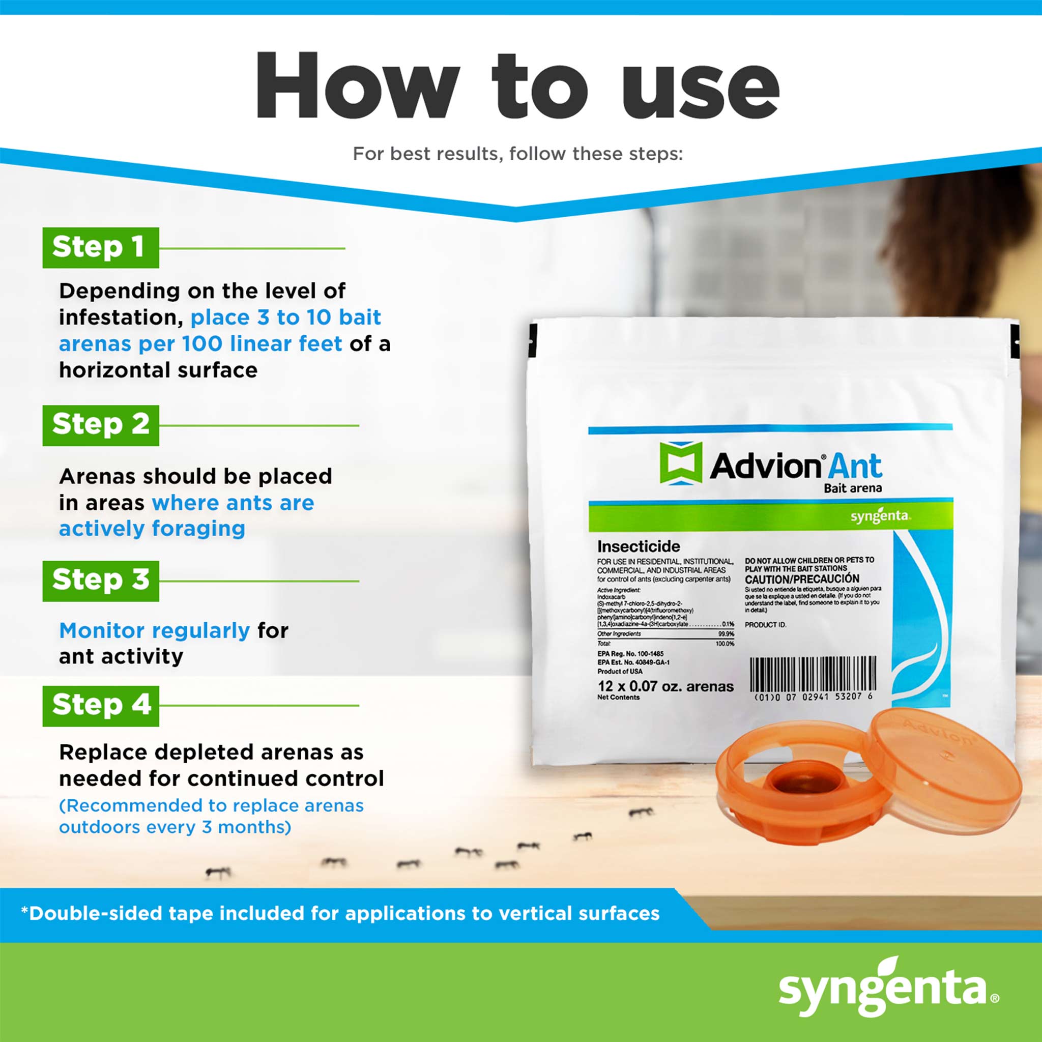 4. In addition to being placed directly along foraging trails, place ADVION ant bait arenas along walls, under appliances or industrial equipment, inside garbage containers, inside cabinets, under furniture, or any locations where there is ant activity or ants can potentially gain entry into a building or structure.