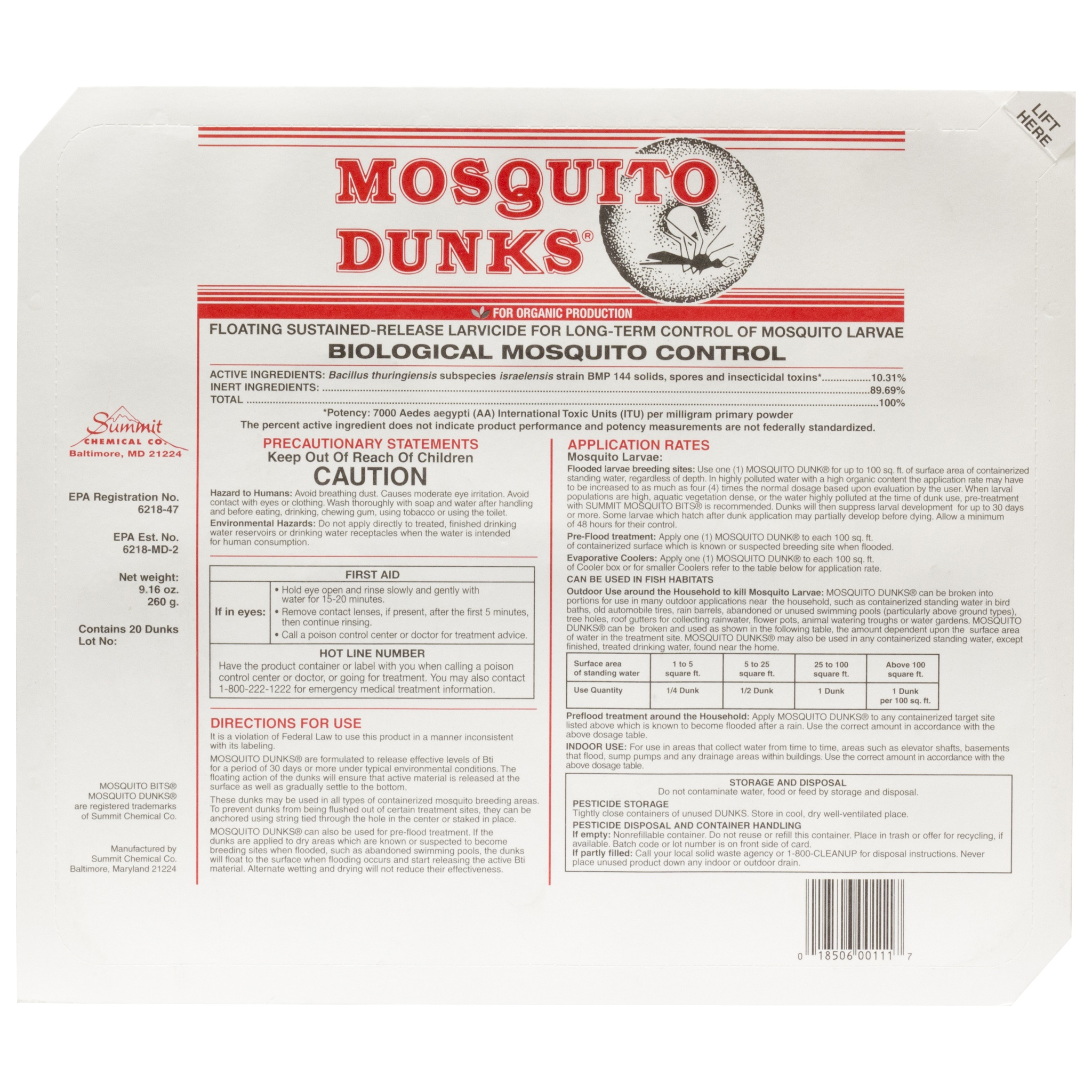 Pre-Flood treatment: Apply one (1 ) Summit B.t.i. BRIQUET/DUNKS to each 100 sq. ft. of dry bed surface which is known or suspected breeding site when flooded.