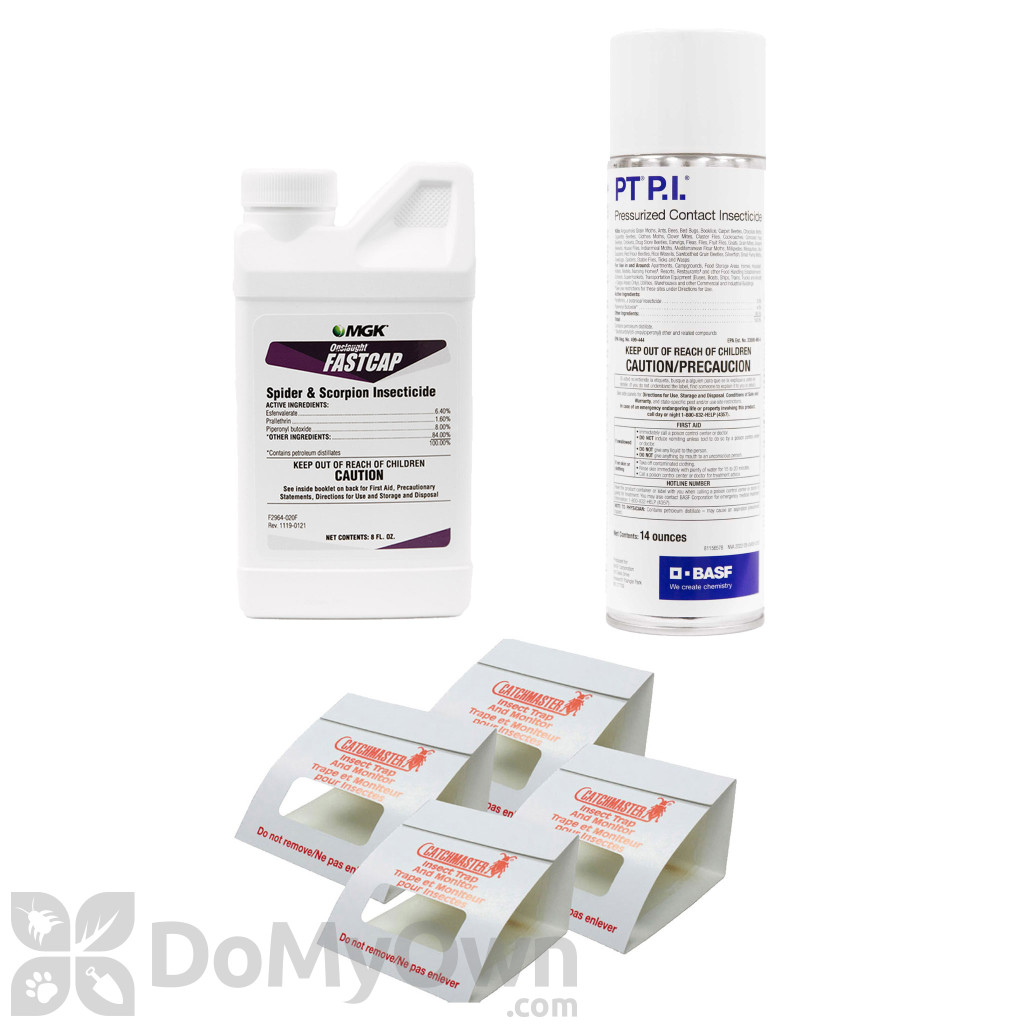 This kit includes the microencapsulated insecticide concentrate Onslaught FastCap - which contains 3 powerful active ingredients, Esfenvalerate, Piperonyl butoxide, and Prallethrin, to provide both initial kill and long-term residual kill.  The included PT PI is a ready-to-use aerosol insecticide that kills spiders and insects quickly on contact. Finally, Catchmaster 100i Insect Monitors trap spiders and insects to help Identify which pests are present and to monitor your treatment.You will need a pump sprayer to apply the Onslaught FastCap concentrate.