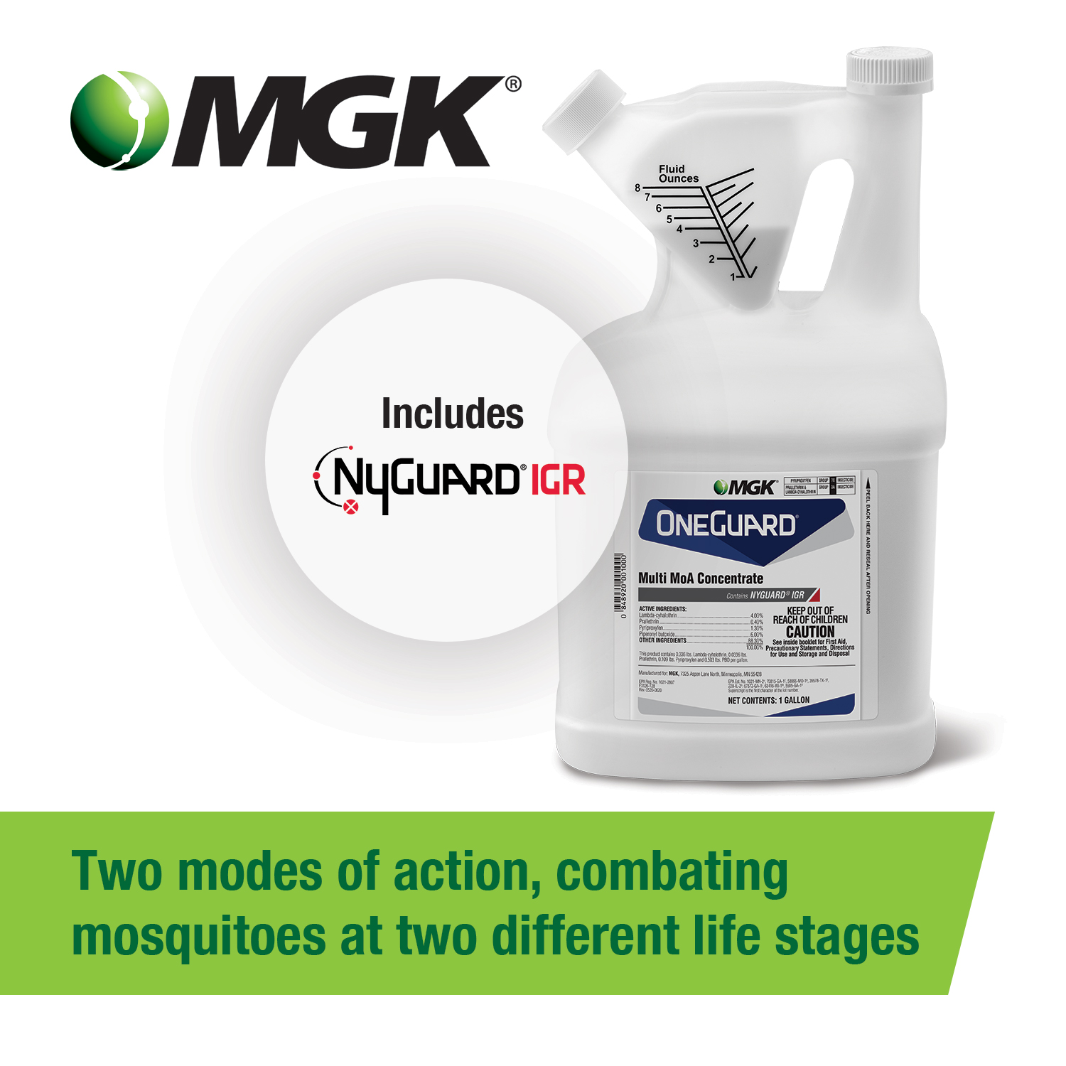 OneGuard is a multi-MoA Concentrate that provides long-lasting control of mosquitoes and other flying and crawling insect pests. It contains a powerful combination of knockdown agent, killing agent, synergist, and NyGuard Insect Growth Regulator (IGR) in a single product. It features controlled-release technology to ensure effective knockdown, kill, and control of insects. It has a dual mode of action to help increase efficiency, plus it reduces mosquito populations by preventing them from reproducing. It is designed to kill mosquitoes such as Aedes, Anopheles, and Culex that may transmit West Nile virus, Zika virus, and Chikungunya virus. This liquid concentrate is a convenient all-in-one product that will provide a solid solution to your insect control needs.