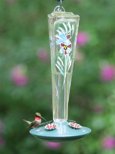 The Opus Violet Meadow Hummingbird Feeder 8 oz. (8111) is a no-drip, hardened glass feeder that is specifically designed for Hummingbirds. It comes with an eye-catching hand-painted glass container that is perfect for your classy yard or garden. The feeder has a metal base cover, 4 flower-formed feeding ports that are bee resistant and integrated perches that will let Hummingbirds to stay for a while. Also, the unit includes an ant moat to prevent ants from reaching the nectar. Violet Meadow Hummingbird Feeder has a capacity to hold eight ounces of nectar. It is easy to clean and fill due to its wide-mouth reservoir.
